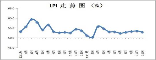 中國物流與采購聯(lián)合會發(fā)布的2013年11月份中國物流業(yè)景氣指數(shù)(LPI)為53.0%,比上月回落0.6個百分點。分項指數(shù)中,業(yè)務(wù)總量指數(shù)、新訂單指數(shù)、設(shè)備利用率均出現(xiàn)不同程度的回落,但都保持在50%以上,顯示出物流業(yè)經(jīng)濟仍然保持著平穩(wěn)較快增長,但增勢有所減緩。